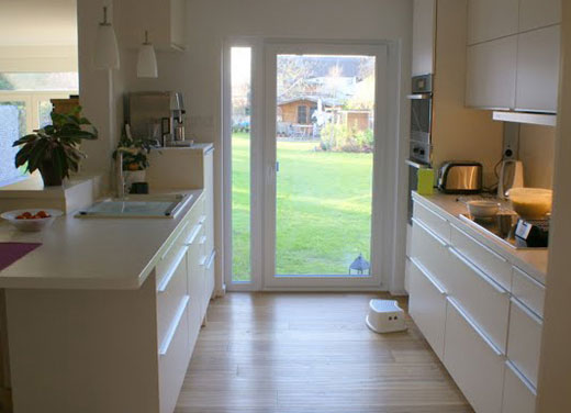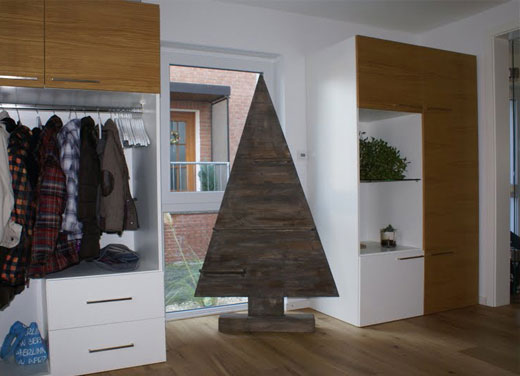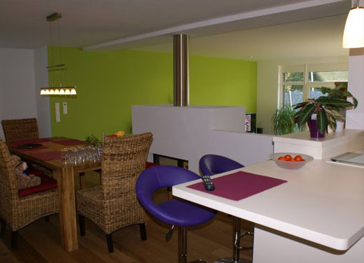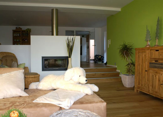 Der Wohnbereich im neuen Anbau ist um drei Stufen abgesenkt und befindet sich auf Gartenniveau.