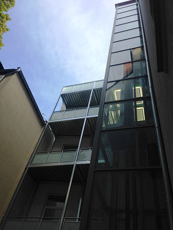 Der verglaste Aufzugsschacht fügt sich in die vorhandene Bebauung ein.