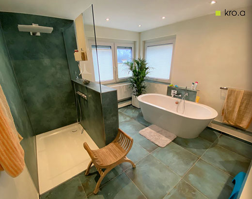 Bei dem Raum im OG des Wohnhauses handelte es sich um eine Wohnstube, die komplett entkernt und in ein modernes Familienbad umgebaut wurde.