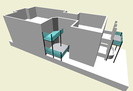 Die vorgeständerte Balkonanlage wurde als Stahlkonstruktion auf Betonfundamenten gegründet.