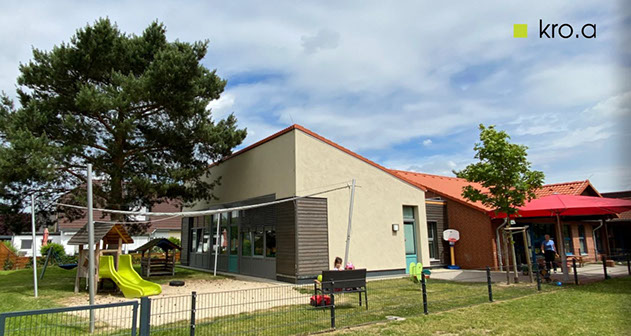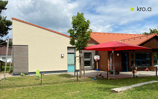 Der Kindergarten in Poggenhagen erhielt einen neuen Personalraum mit Teeküche und WC. Die Bebauung wurde dem Bestand angepasst.