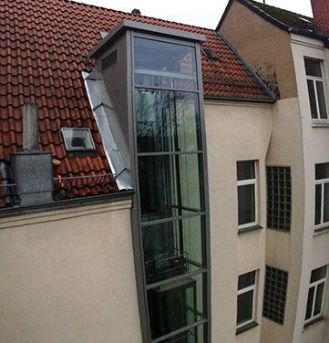 Der verglaste Aufzugsschacht fügt sich in die vorhandene Bebauung ein.