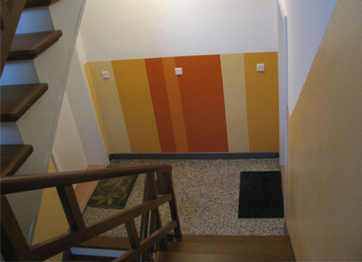 Treppenhaus nach der Sanierung: Für jedes Gebäude wurden individuelle Farbkonzepte entwickelt.