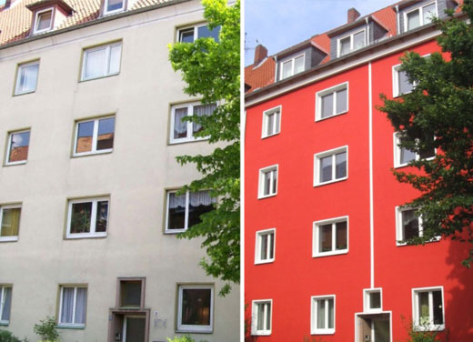 Vor / Nach der Sanierung: Die Fassade wurde mit einem Wärmedämmverbundsystem verkleidet, die Dachdämmung und -eindeckung wurden gemäß neuesten Energiesparanforderungen erneuert.